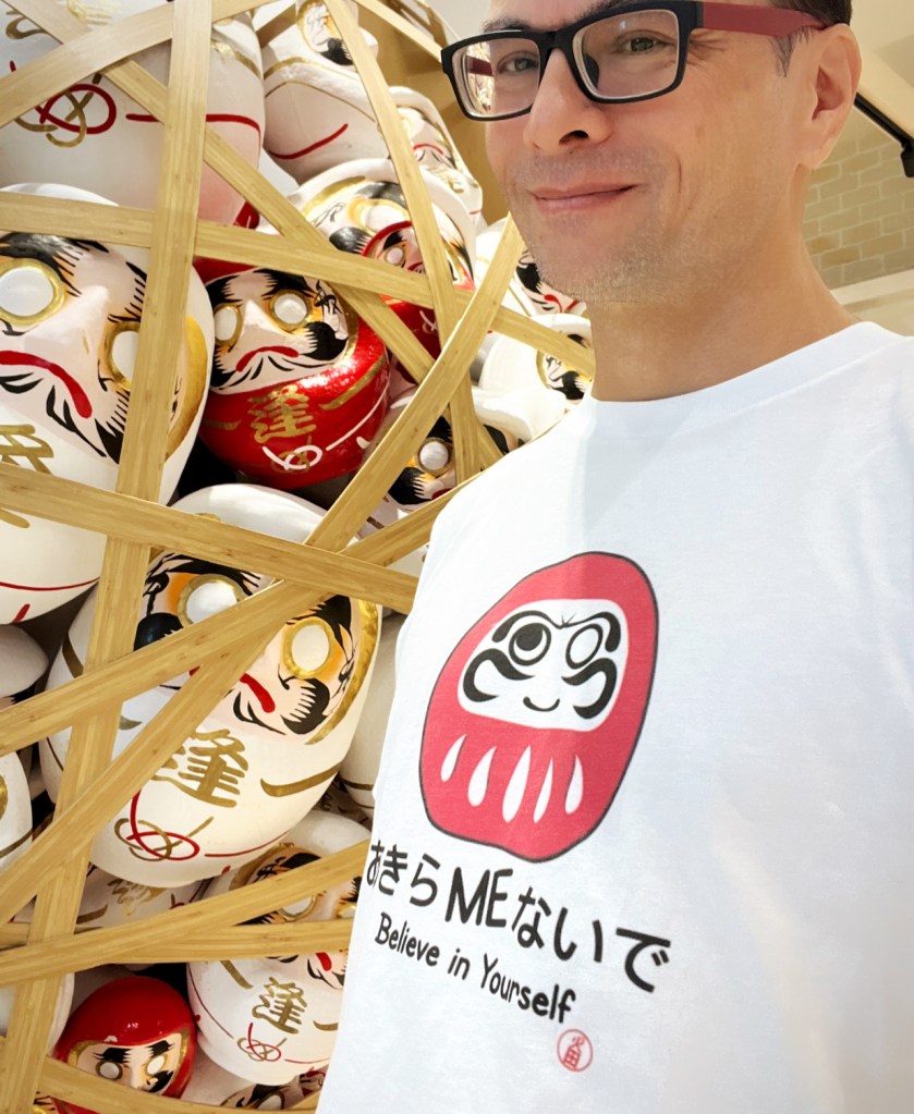 あきらめないで means don’t give up. I changed the hiragana め to its ABC spelling ME to point out the English word ‘me’. Don’t give up on yourself. When you have a dream work to make it true. People use the daruma as a little movtivator, painting in one eye to promise try. I use the daruma as a reminder of a promise I make to myself, to me. I never want to give up on the little guy.