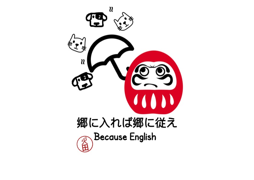 郷に入れば郷に従え, go ni haireba go ni shitgae. When in Rome do as the Romans do. The text for the t-shirt should change the GO kanji to 語。 This suggests a when in English be English feeling. There often is no why for why English or any language follows the patterns it does- or breaks them. It can be better to go with the flow— hmmm, second GO to katakana FLOW? 語に入ればフローに従え. i.e. Don’t get hung up on why it rains cats and dogs, just go with the flow and let the mystery be.
