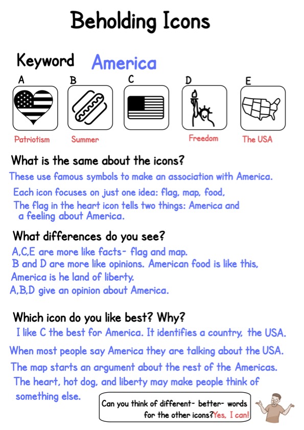 Go to The Noun Project type in any word and see what kinds of icons come up to represent that word. Think about how they represent that word, what are the essential parts of it. What nuances are there? I tried this with the word ‘America’. Lots of icons came up, I picked 5 to work with. What do you think about the choices I made?