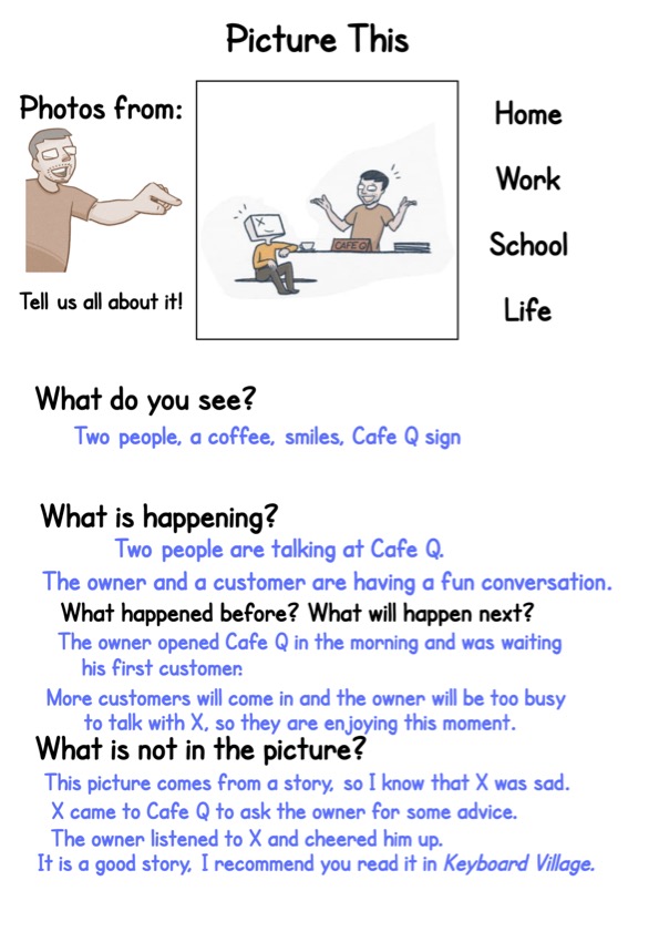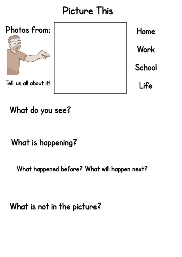 Pictures help us get started. They give prompts, context and help fill in the gaps of things we don’t know how to say. When we look at a picture together everybody knows what we are talking about.